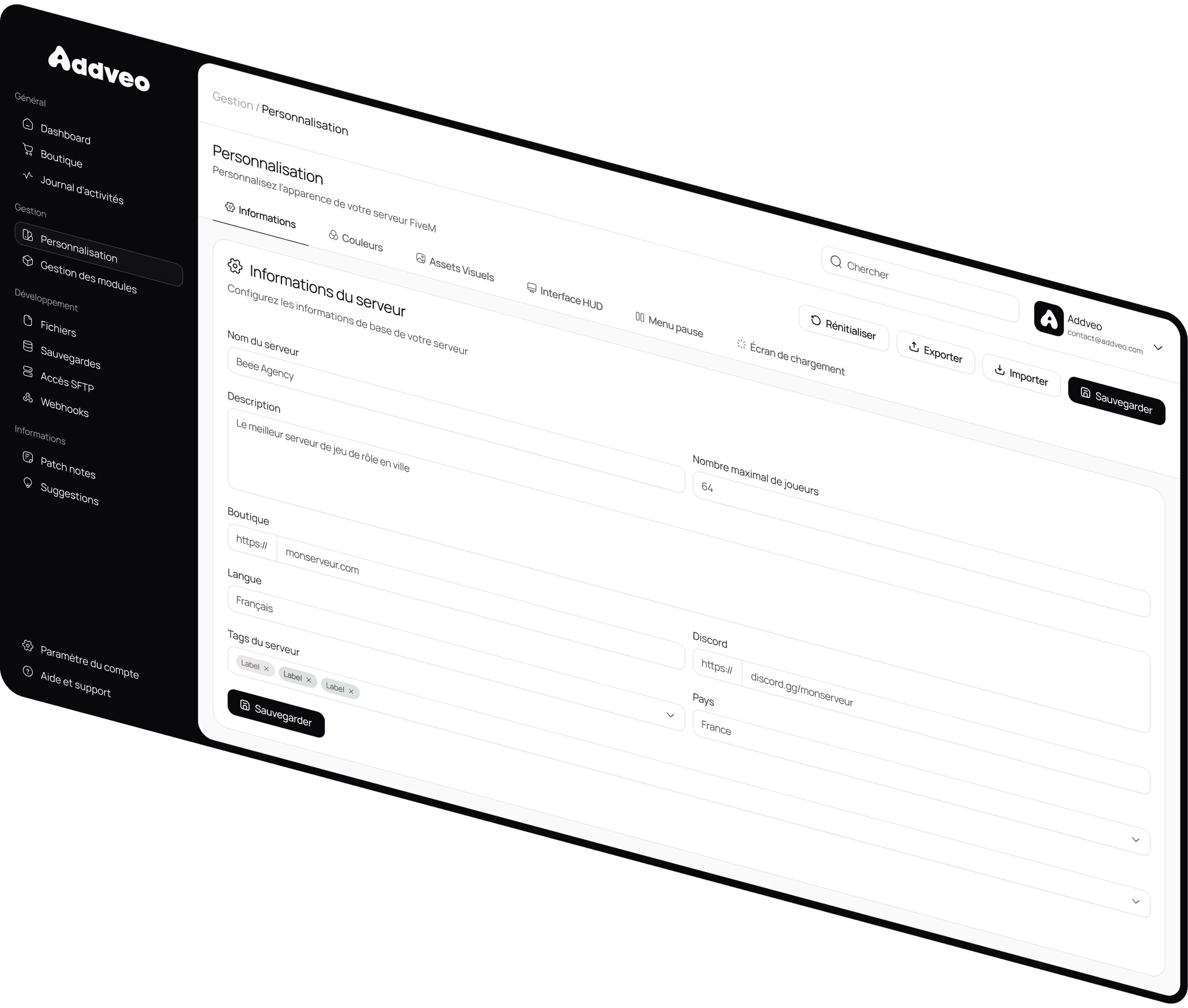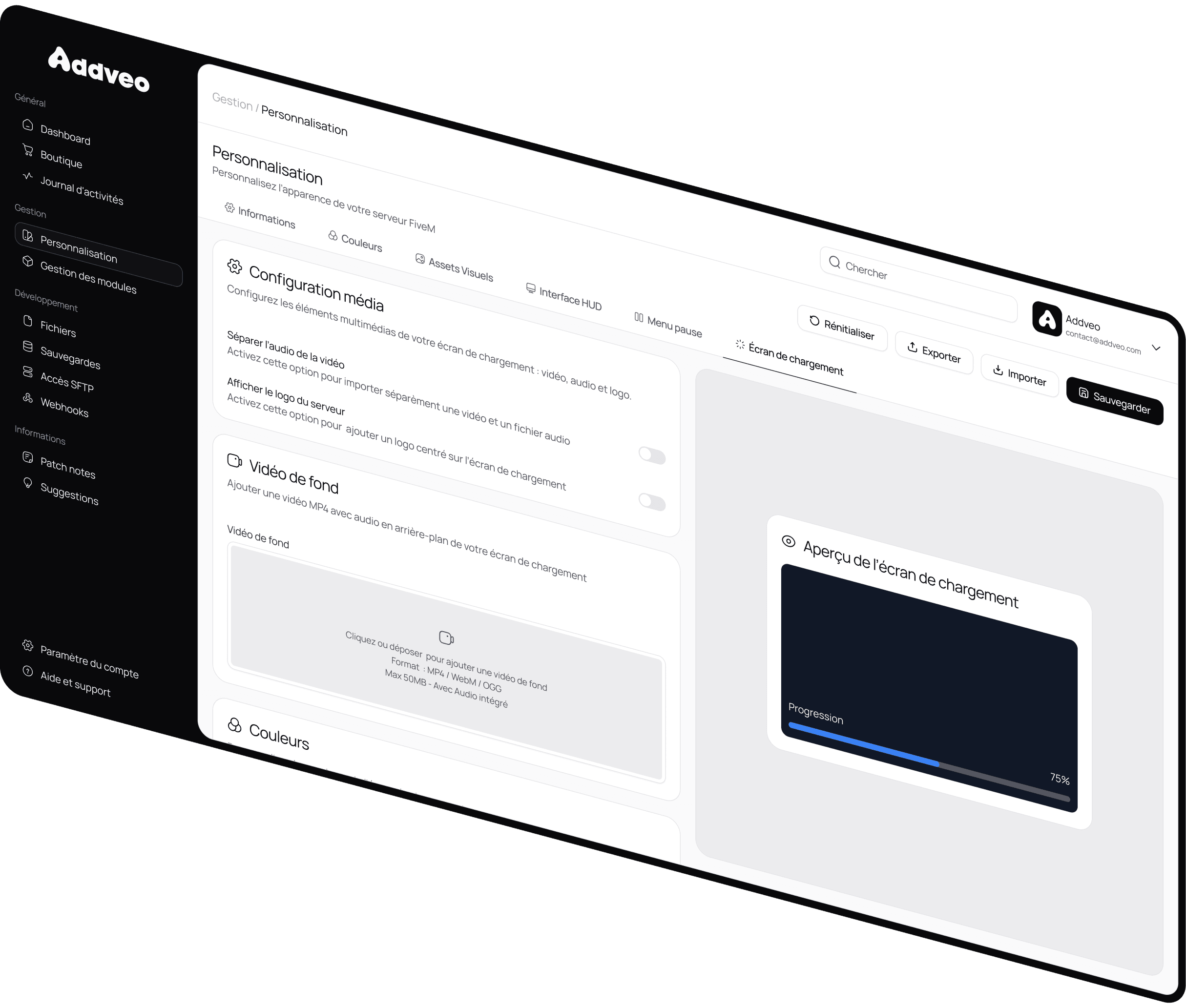 La solution Addveo est le centre de commande de votre serveur. Tout se fait en quelques clics : configuration, personnalisation, lancement, gestion, mises à jour.