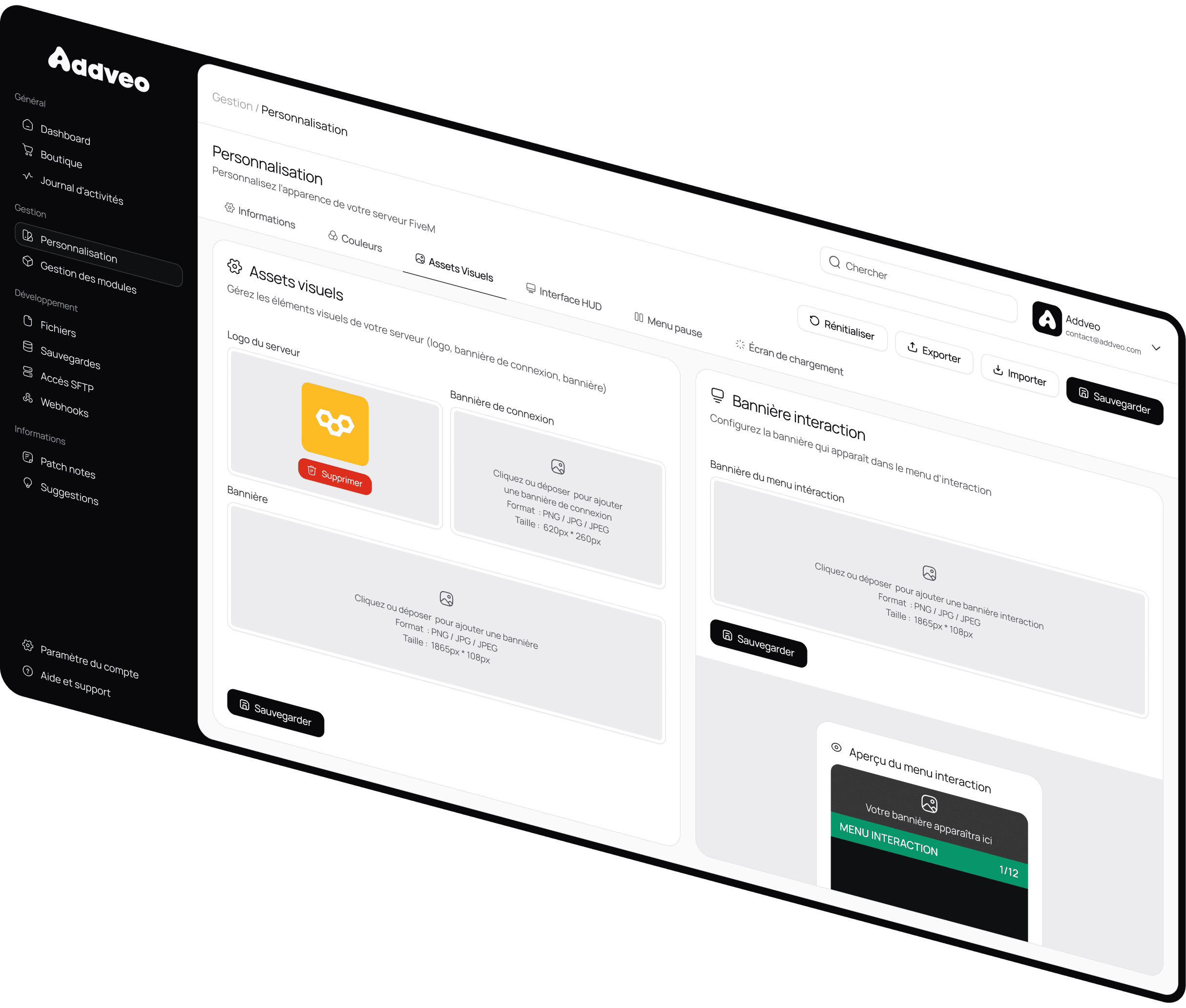 Logos, couleurs et assets configurables depuis le panel.
